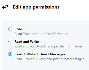記事を見るウェルカムメッセージを設定するためには以下の画像のようにアプリケーションの権限をRead + Write + Direct Messagesにする必要があります。